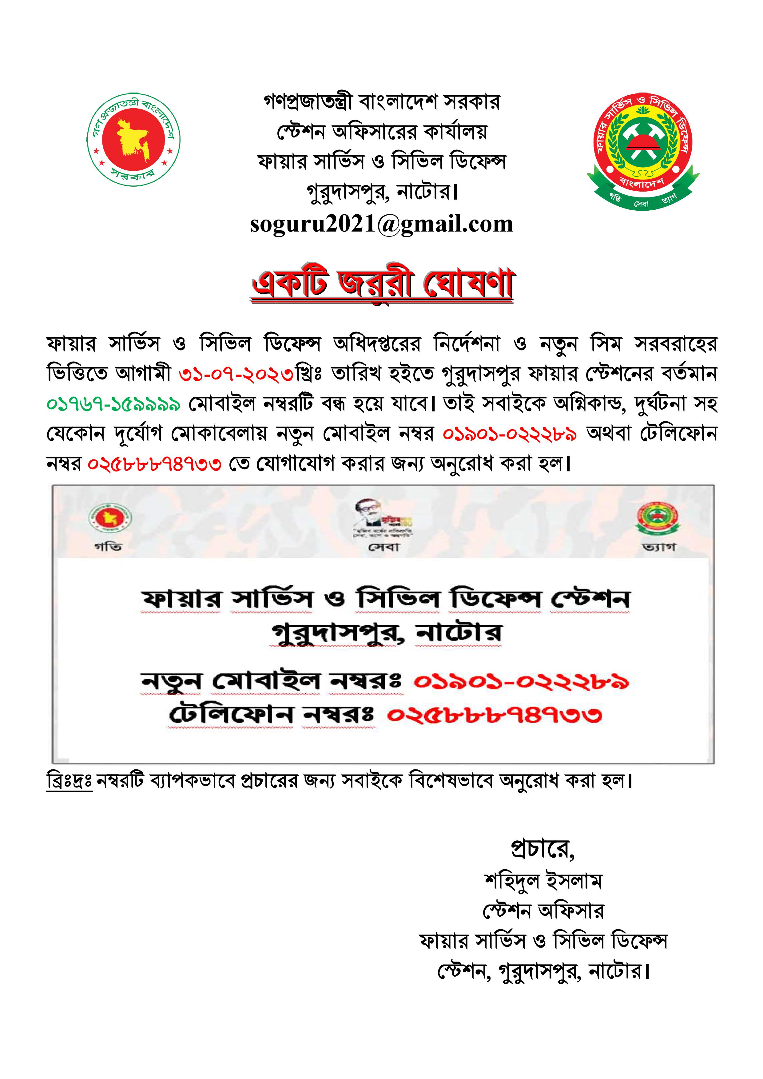 ফায়ার সার্ভিস ও সিভিল ডিফেন্স স্টেশন, গুরুদাসপুর, নাটোর এর নতুন মোবাইল নম্বর।